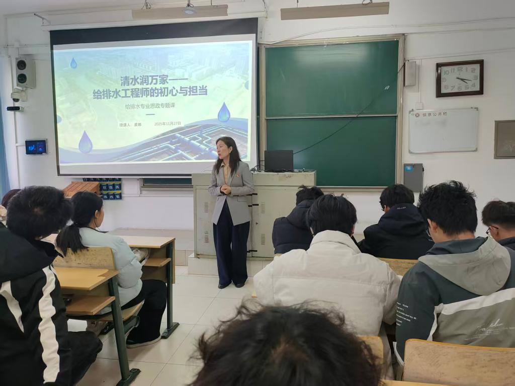 为引导青年学生将专业所长与时代使命紧密结合,11月27日,城市与建筑工程学院院长裘娜以“清水润万家——给排水工程师的初心与担当”为主题,为25级给排水科学与工程专业学生带来一堂内涵丰富、贴近实际的专题思政课,让学生在感悟专业价值中明确成长方向。